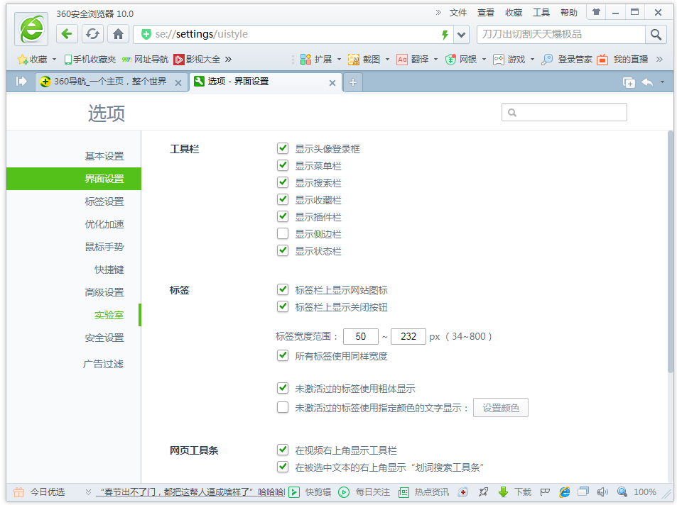 进入以下界面,点击切换【界面设置】一栏,在工具栏中找到并勾选【显示收藏栏】,即可恢复浏览器收藏栏。