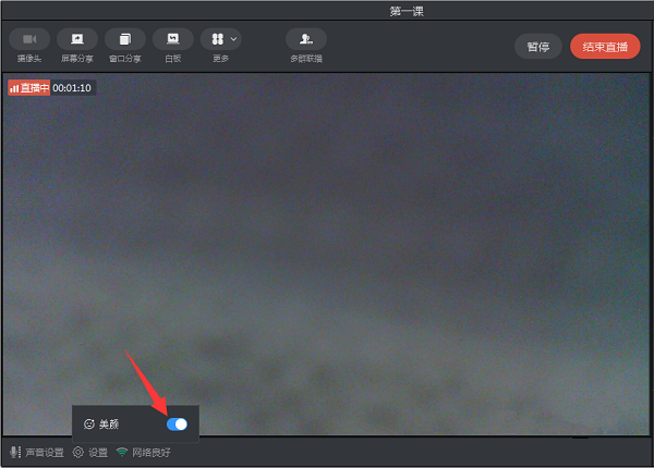 进入直播窗口,点击左下方的设置按钮,点击开启美颜功能。