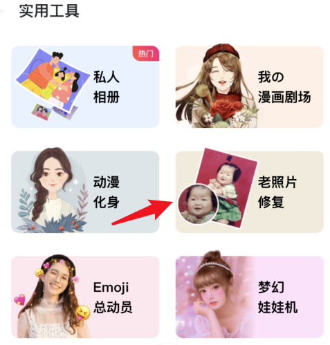 在手机中打开美图秀秀,进入首页,点击下方的【工具箱】,展开窗口,选择【老照片修复】功能,