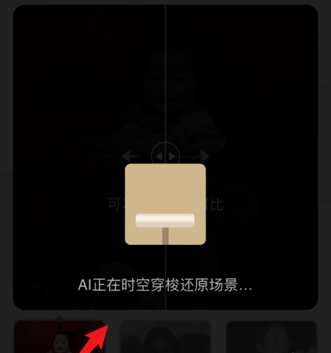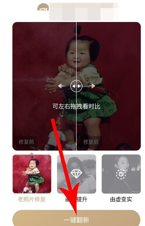 进入以下界面,左右拖动滑块,你可以查看照片修复效果,然后点击【一键翻新】选项,