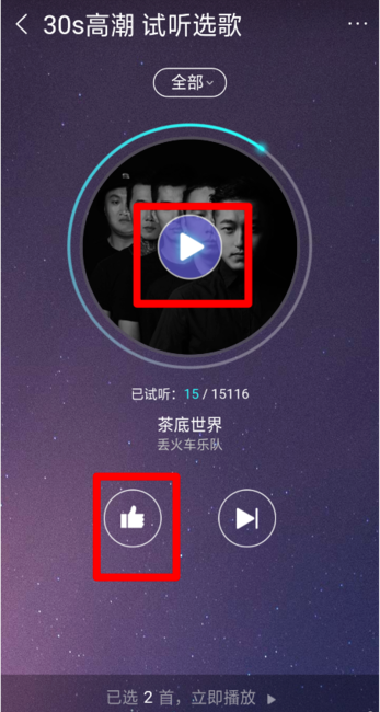 点击【音乐工具】——【高潮挑歌】,进入试听选歌页面,点击播放按钮,试听30秒,如果你喜欢这首歌,点赞即可,如果不喜欢,继续播放下一首,