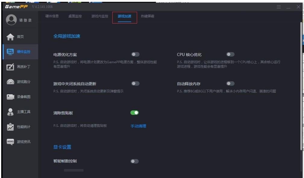 如图,游戏加加只是默认仅开启【清除剪贴板】功能,勾选【电源优化方案】,软件会结合当前设备提供最佳游戏方案,启动游戏时即会将电源计划更改为GamePP电源方案,