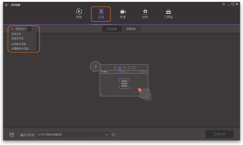 从本站下载安装万兴优转,打开软件,进入界面,点击切换【压缩】标签页,如图所示,