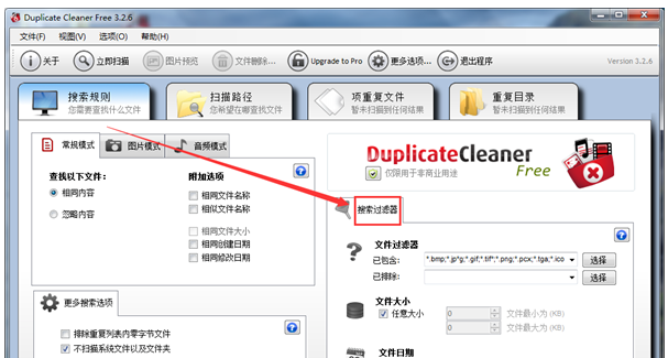 如果想使用图片模式,必须购买升级至高级版本,所以小编直接介绍【常规模式】,点击【搜索规则】——【搜索过滤器】,进行如图设置,