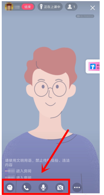 现在进入直播间,即可开始上课,如图,界面底部有四个图标,其功能分别是评论、连麦、麦克风、摄像头,