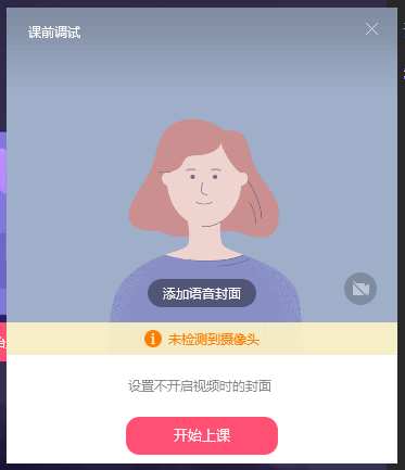 现在进行课前调试,你可以点击【添加语音封面】,因为小编电脑上没有摄像头,所以检测不到,