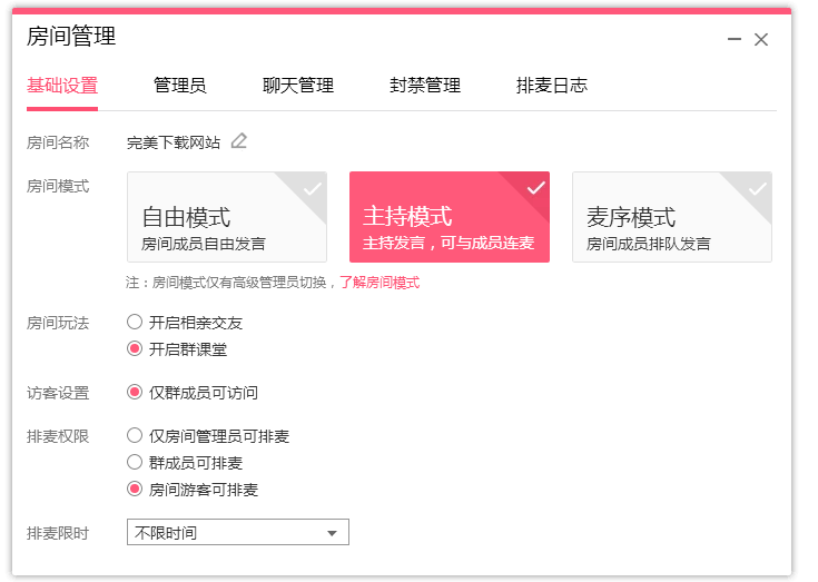 点击窗口右上角的【房间设置】按钮,如图,你可以进行相关设置调整。