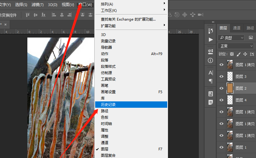 在菜单栏中点击【窗口】——【历史记录】选项,如图所示,