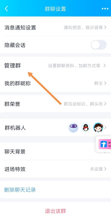 进入群聊设置界面,找到并点击【管理群】选项,