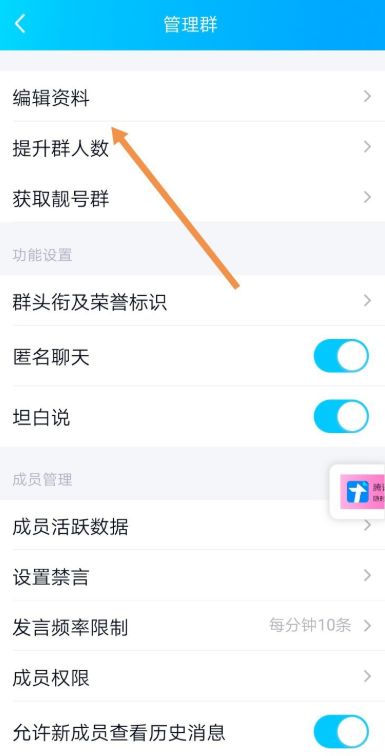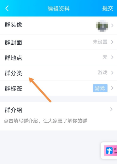 进入【管理群】界面,如图,点击【编辑资料】,选择【群分类】选项,