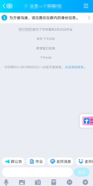 至此,我们就将一个普通的QQ群成功修改为家校群,为了方便沟通,需要完善个人身份信息,