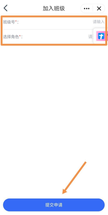 打开小程序,进入以下界面,点击【加入班级】,如图,输入班级号,选择你的角色,点击【提交申请】,