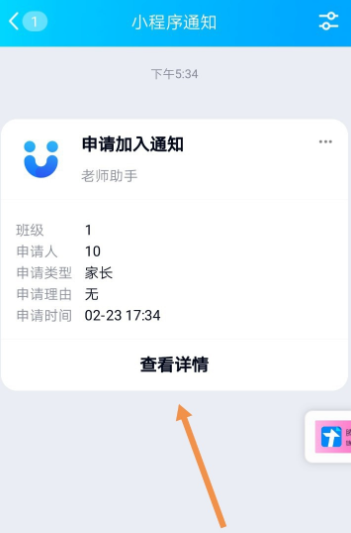 发出申请之后,老师可以在“小程序通知”窗口收到你的申请,然后点击【查看详情】,