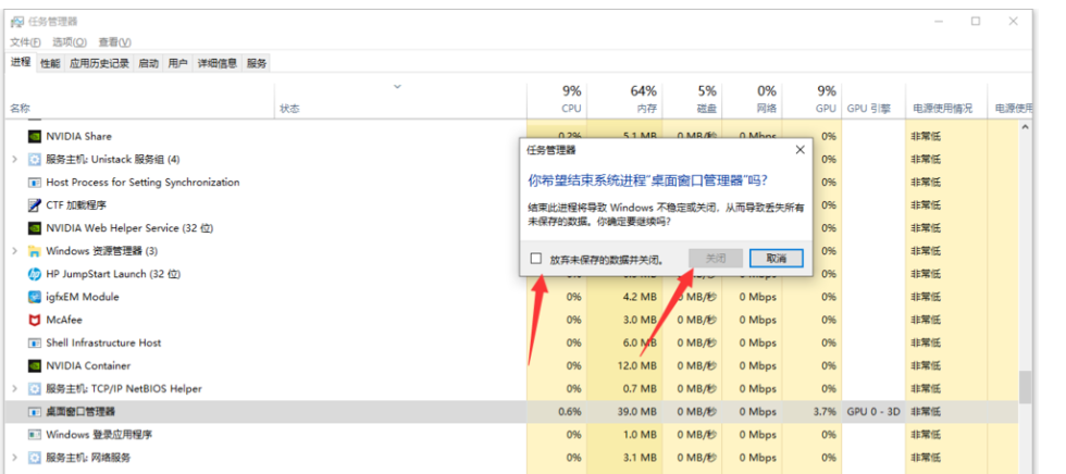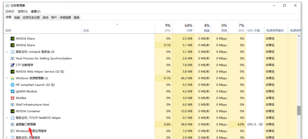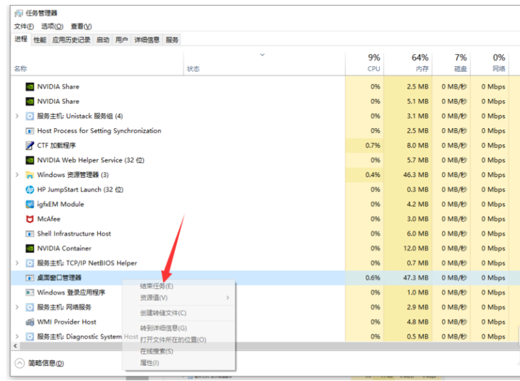 鼠标右击【桌面窗口管理器】,弹出菜单,选择【结束进程】,