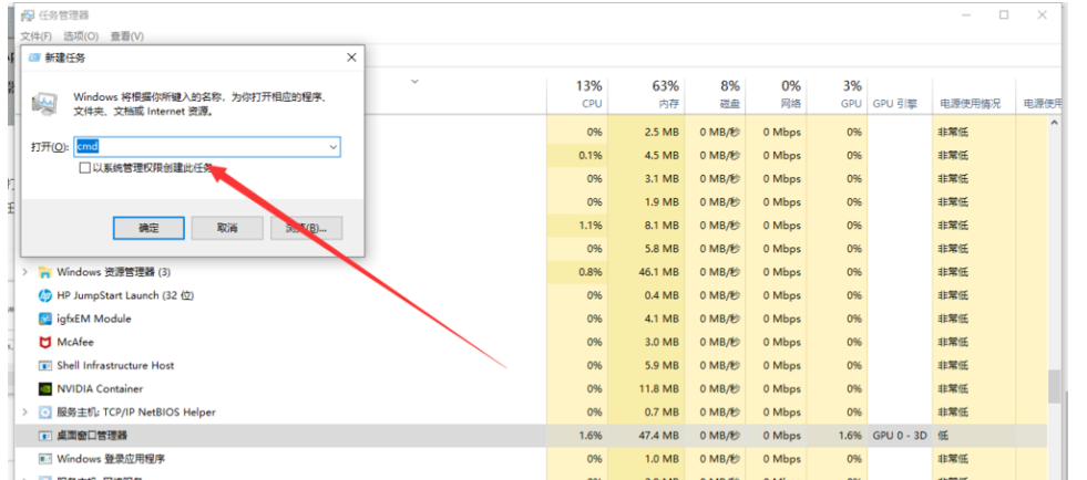 如图,弹出新建任务对话框,输入dwm.exe,点击确定,实现桌面管理重新启动,问题解决了!