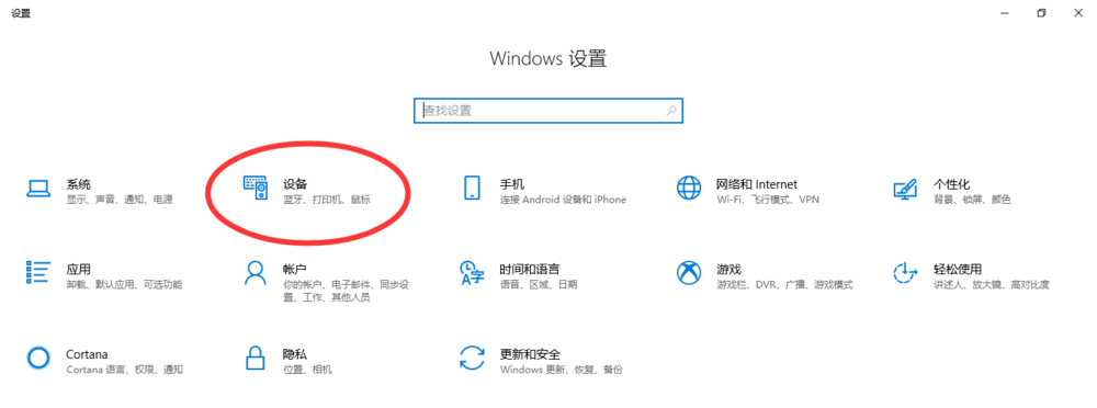 以Win10系统为例,呼出开始菜单,点击【设置】,如图,进入Windows设置中心,点击【设备】选项,