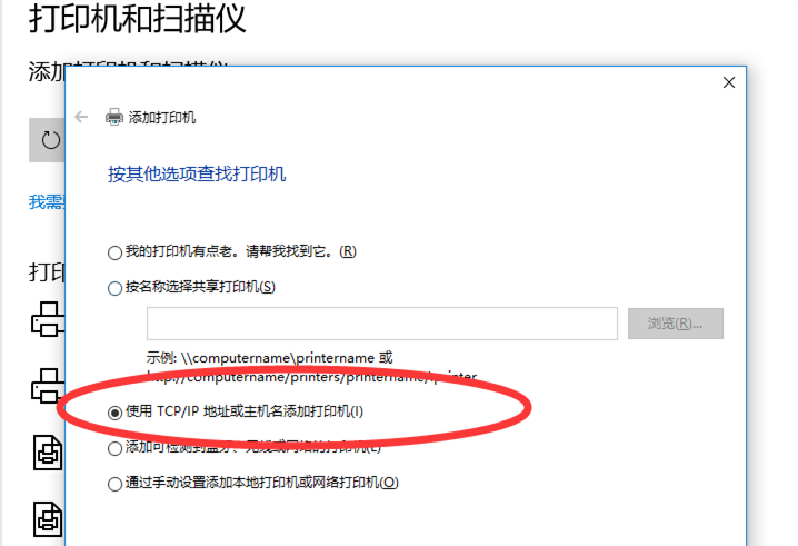 弹出新窗口,如图,选择【使用TCP/IP地址或主机名添加打印机】,继续下一步,