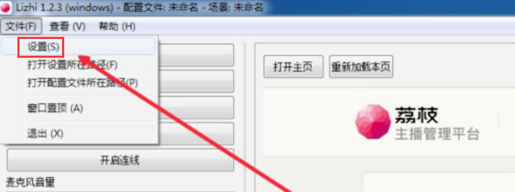 2、在荔枝FM直播助手的“文件”下拉菜单中,点击“设置”选项,进入背景音乐的设置,