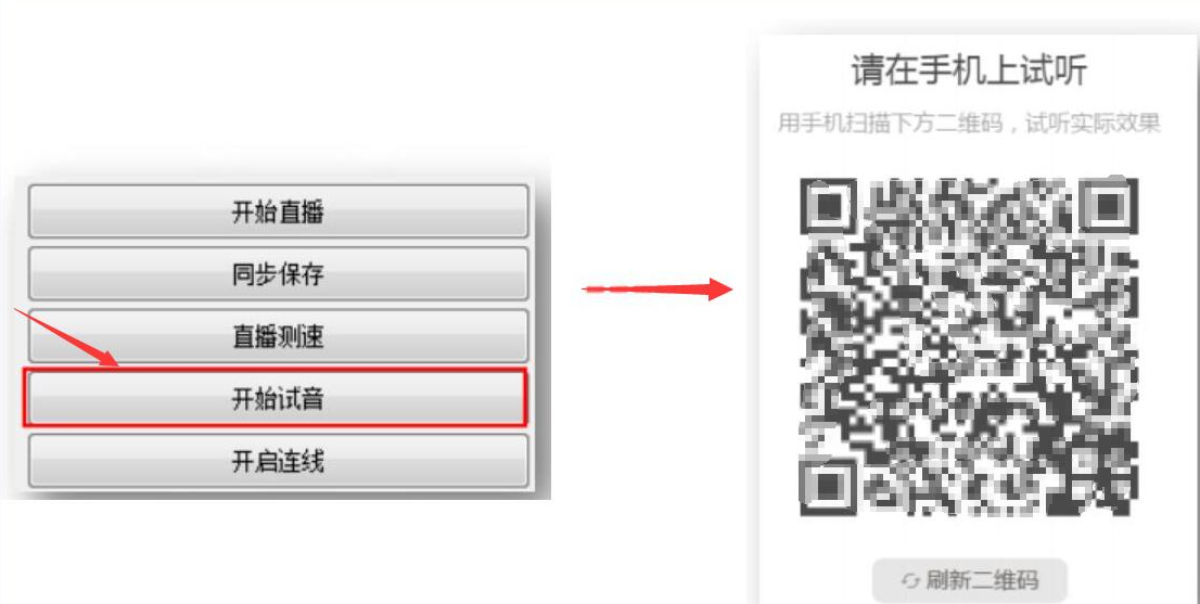 4、回到荔枝FM直播助手的主界面,在左方功能栏中点击“开始试音”,并且用自己的手机扫码进行试听自己的节目,