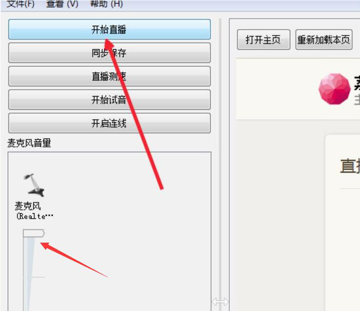 6、测试完成,回到荔枝FM直播助手主界面,调节麦克风的音量,再点击“开始直播”,即可正式开始直播节目。