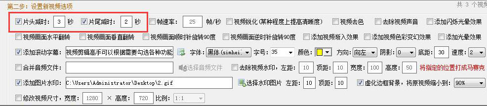 4、导入视频成功,在“设置新视频选项”中勾选“片头减时”和“片尾减时”,根据自己需要来设置各自的数值,