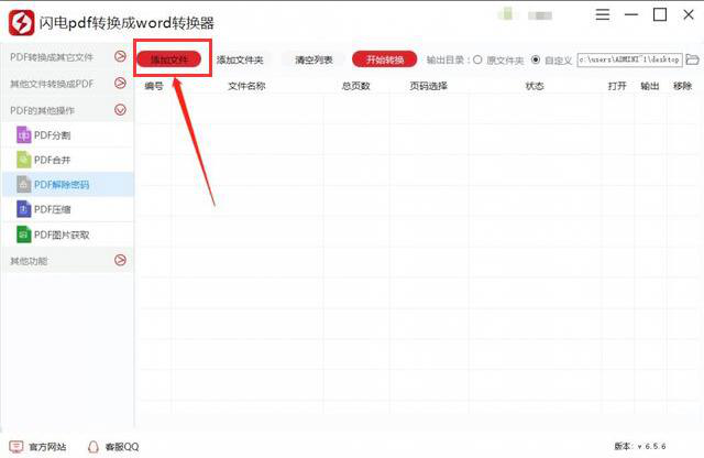 3、接着,在闪电pdf转换器中点击“添加文件”将需要解除PDF密码的文件添加进该软件中。