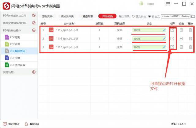 6、最后,我们就可以在闪电pdf转换器中看到它解除PDF密码的进度了。等全部完成后,点击打开,就可以预览pdf文件了。