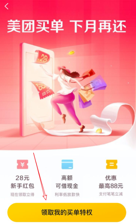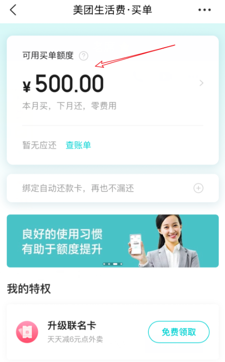 如图,这里显示了用户当前的美团买单额度,以后你就可以使用美团买单功能进行消费付款,即可实现先消费后付款。
