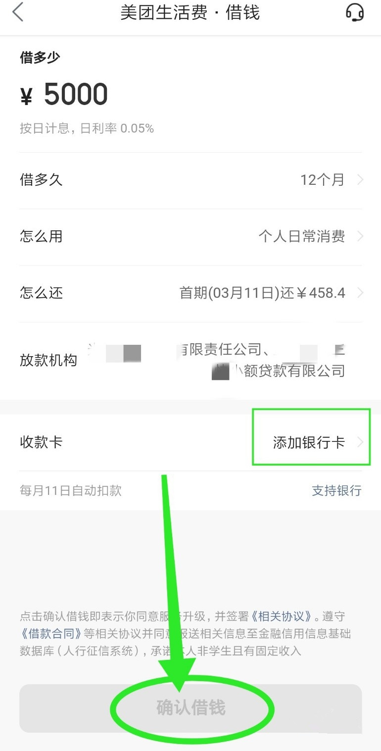 输入买单提现金额,点击【确认借钱】,买单额度即可提现成功,前提是美团必须添加绑定银行卡。