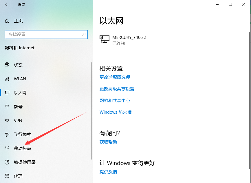 进入以下界面,如图,在左侧菜单栏中点击【移动热点】,