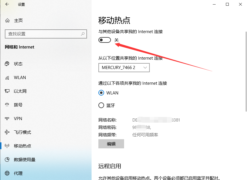 【移动热点】功能默认处于关闭状态,将其点击打开,如图所示,