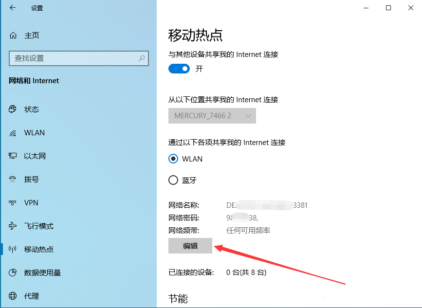 这时你就可以看到移动热点的连接名和密码,点击【编辑】按钮,即可修改连接名和密码,如图所示,