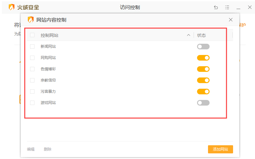 打开对话框,如图,选择需要屏蔽的网站类型;另外,你还可以点击【添加网站】,手动输入目标网站,并将其保存。