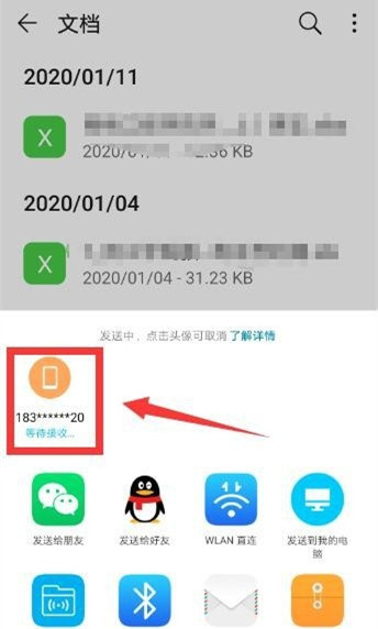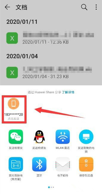 然后在另一个手机设备的控制菜单栏中点击【Huawei Share】,你的手机就会自动检测识别周围的设备,如图,点击目标设备,即可发送文件,
