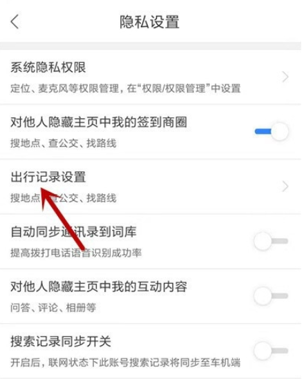 进入隐私设置界面,点击【出行记录设置】选项,