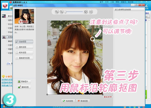 3、在弹出界面点击“自由抠图”,用鼠标沿轮廓抠图,点击“完成抠图”,如下图: