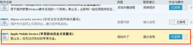 2、如果显示是“已禁用”,那么就切换到“已启用”,接着重启快用苹果助手。有些用户在操作电脑时,不小心误删快用苹果助手的驱动,所以,想它连接上苹果手机,那就得重新下载该驱动程序。