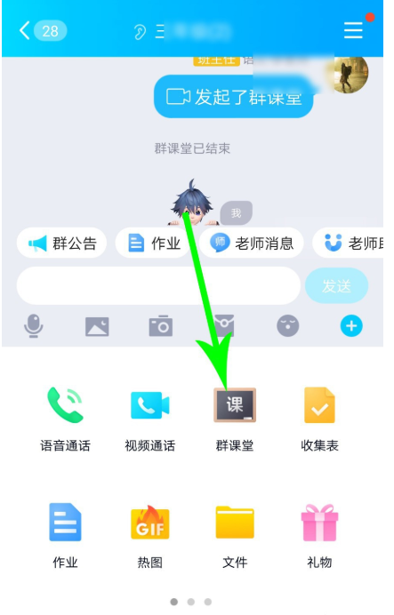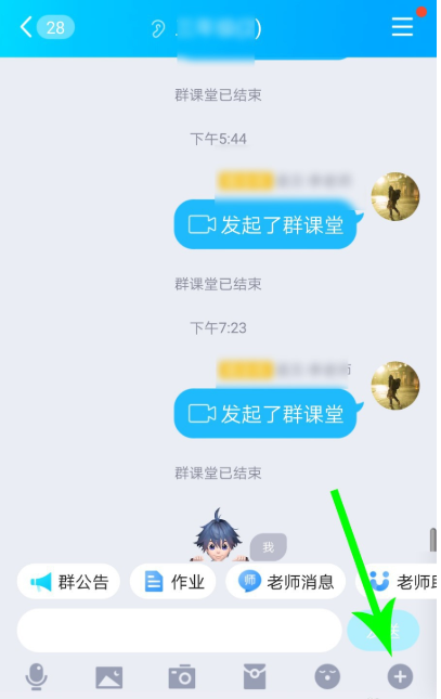 打开手机QQ,点击进入班级群聊,然后在窗口中点击【+】,