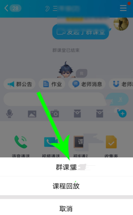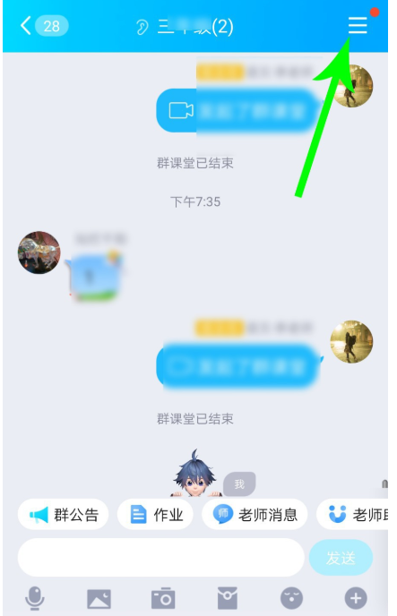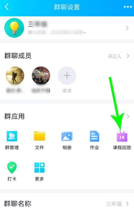 打开手机QQ,点击进入班级群聊,在窗口中点击主菜单图标,然后进入群聊设置界面,点击【课程回放】,