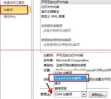 4、在弹出界面点击“加载项”,然后点击“管理”,选择“PowerPoint加载项”,如下图: