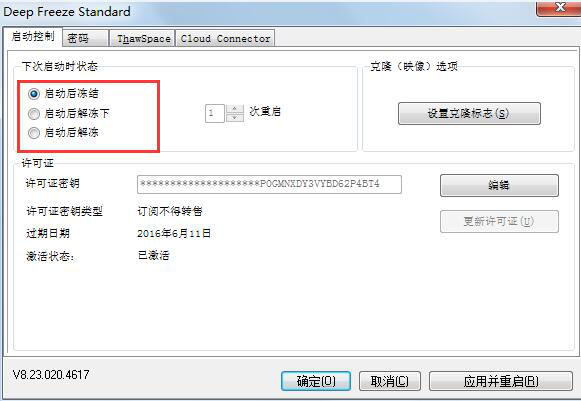 选择“启动后冻结”,当电脑重启后系统便会还原至原始状态;“启动后解冻下”,用户可以自由设置电脑不被保护的次数;而“启动后解冻”则是用户放弃对电脑所有硬盘的保护。