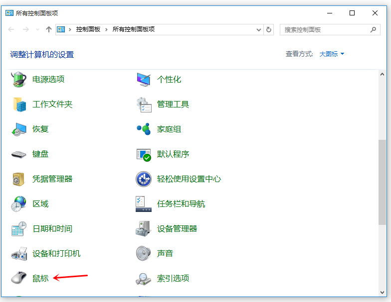 打开控制面板,如图,选择【查看方式】为大图标,然后找到并点击【鼠标】,