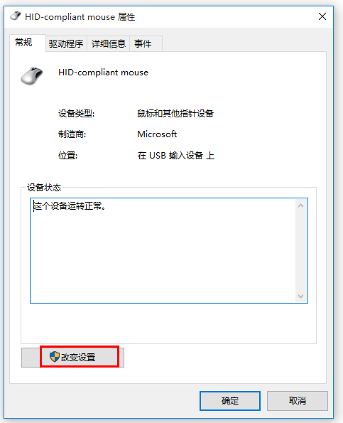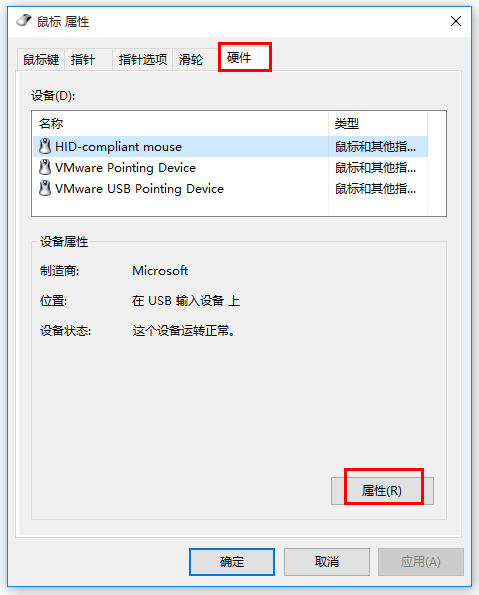 打开鼠标属性面板,如图,切换【硬件】标签,选择设备,点击【属性】,