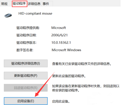 弹出新窗口,切换【驱动程序】标签,然后点击【启用设备】,点击确定,查看问题是否解决。