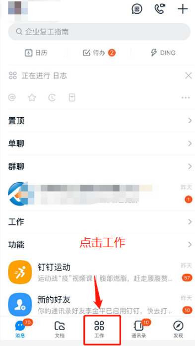 在手机中打开钉钉APP,登录账号,进入界面,如图,点击下方的【工作】选项,