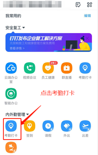 进入工作台,如图,点击【内外勤管理】——【考勤打卡】功能,