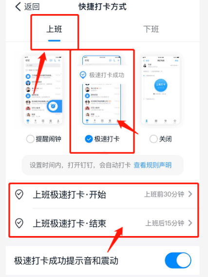 首先设置上班快捷打卡方式,如图,勾选【极速打卡】,设置打卡时间范围,