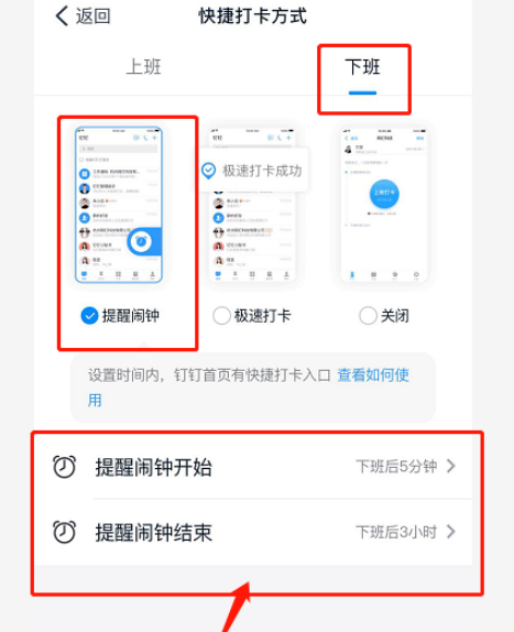 再来设置下班快捷打卡方式,鉴于很多人没有在下班时间打开钉钉的习惯,建议选择【提醒闹钟】模式,下班之后就不会忘记打卡了。