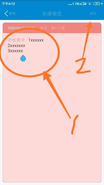 4、设置好标签属性后,我们可以在便签内编辑内容。编辑完成后点击右上方【保存】。这样添加便签的操作就完成了。