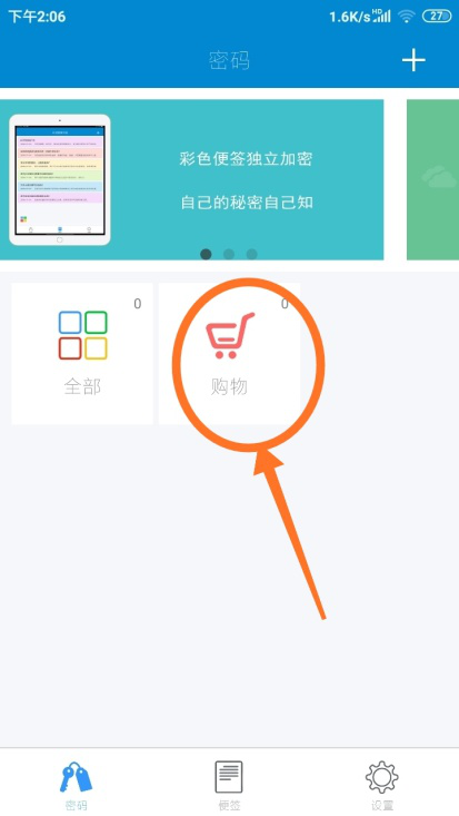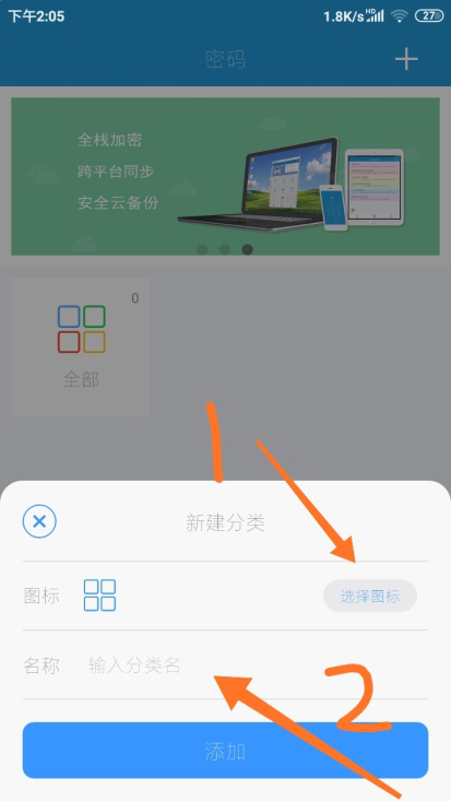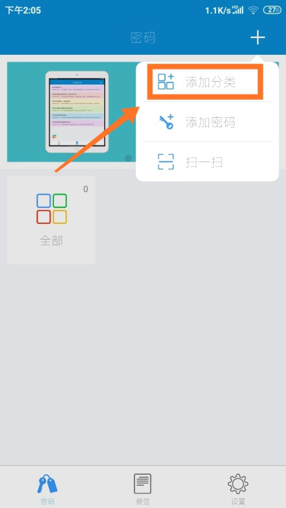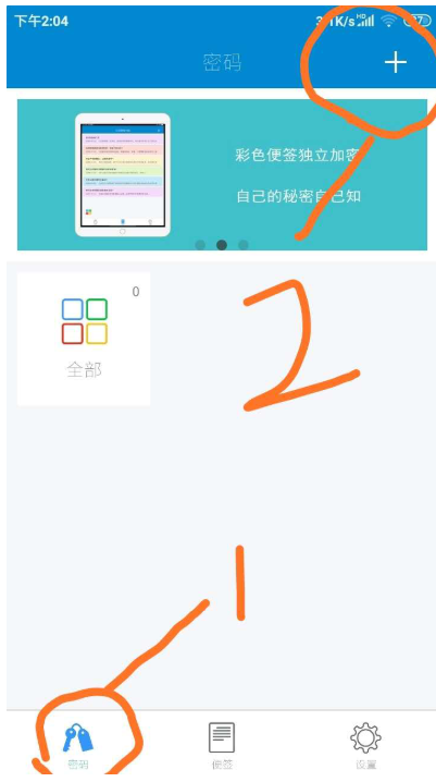 2、进入闪灵密保主界面,按照图示步骤,先点击界面最下方【密码】,然后点击界面右上方【+】。在之后弹出选项中点击【添加分类】。